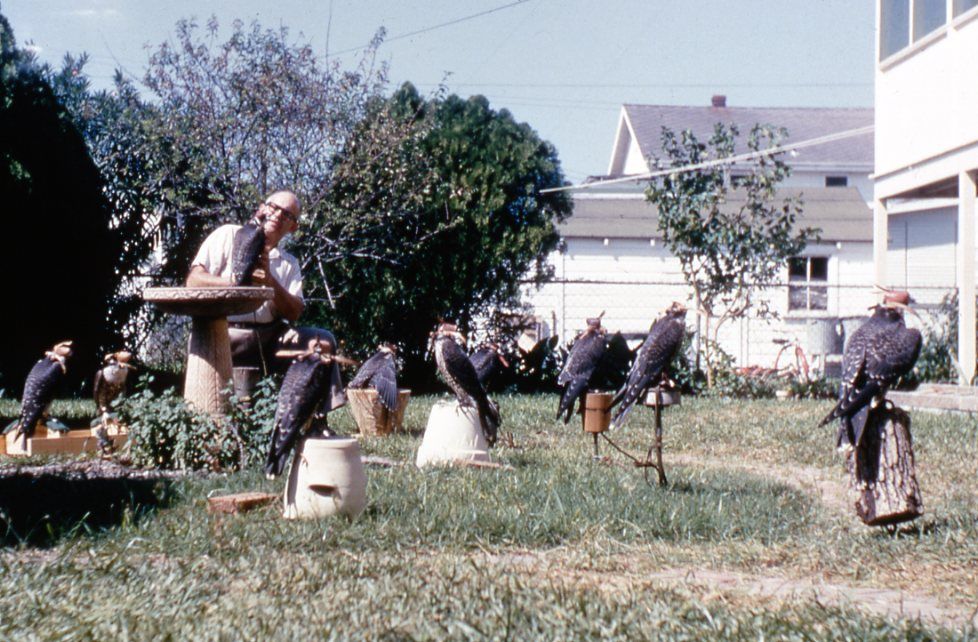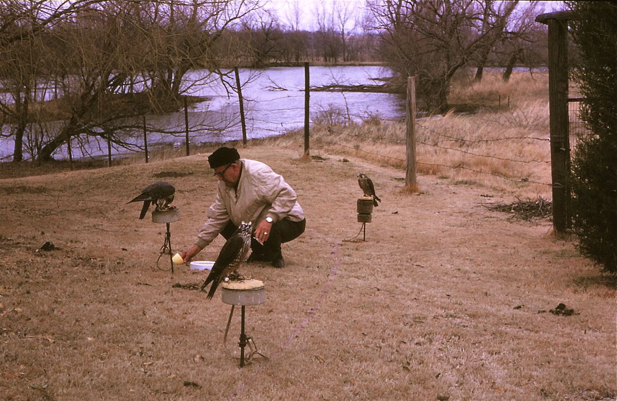 As a matter of record, Fred is credited with being the first Falconer in Oklahoma. In 1949 Fred and family moved to an 80-acre estate southeast of Tulsa. Fred pastured a few steers and maintained a native bluestem pasture. His home was surrounded by a chain of lakes stocked with game fish and teeming with native birds and waterfowl. Fred trained his falcon on racing pigeons and hawked meadow larks in his adjoining pasture which was accessible by a simple walk-over stairs across his fence. His weathering yard and mews were classical and well appointed. His mews were actually constructed as dual-purpose facilities. In addition to the normal fittings one would find in a mews of the day, Fred had also fitted nest ledges in side by side chambers with adjoining barred windows that could be opened or closed. The windows were for introducing the “pairs” to each other.