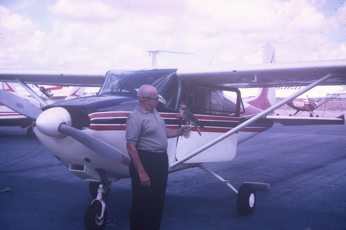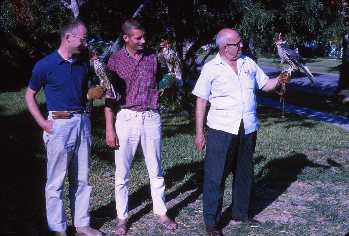 Through the years Fred maintained a close friendship with Col. Meredith, often visiting him on his ranch in Montana, and trapping peregrines on Padre Island. Fred flew his Cessna airplane to Padre Island each fall, and together he and Luff and “Doc” Charles E. Hall would trap for a week. Each day their newly trapped birds were brought home and perched on the lawn and then brought indoors on screen perches. They fed and handled the birds each night and by the weekend had selected the bird of their choice for training. They banded the others on Saturday, fed, and then released them. In later years’ others who trapped peregrines on Padre Island with Fred were Daniel Slowe, Bill Hawkins, Ken Riddle and E.W. “Sonnie” Heiling. All were privileged to experience those wild and free trapping adventures with Fred.