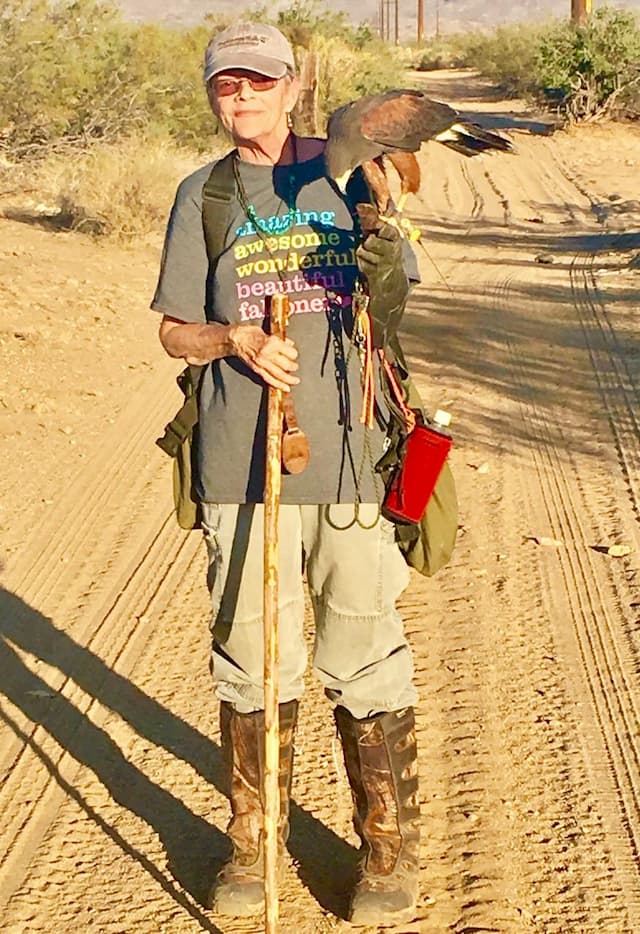 Laura moved to NY around 2013, but progressive rheumatoid arthritis and other health conditions had made New York inhospitable for her—though she still “got it done” and was thrilled when her Harris’ Jack caught his first squirrel. In 2016, Laura moved from New York to Arizona in pursuit of a warmer climate. There she found support from local friends and was able to once more pursue her passion, flying Jack at rabbits and hares in the desert. Though her health became a progressively more difficult obstacle for her to overcome, she rose to this challenge and continued to sponsor new falconers and to fly Jack—with a little help from her friends.