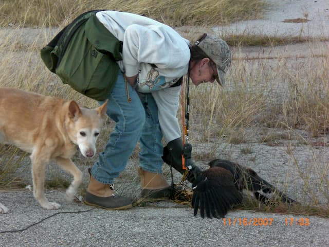 Though many birds came and went over the years, there were two which held a particularly special place in Laura’s heart. Laura trapped a passage red-tailed hawk she named Mariah in 1994 and went on to hawk with her across the United States. She was particularly proud of hawking mallard ducks with her in Wyoming. She survives Laura and is now enjoying a well-earned retirement. Laura wrote about her adventures with Mariah in an unpublished work. Laura also flew a gamey Coulson bred 2000 hatch harris’ hawk named Jack, who also survives her.