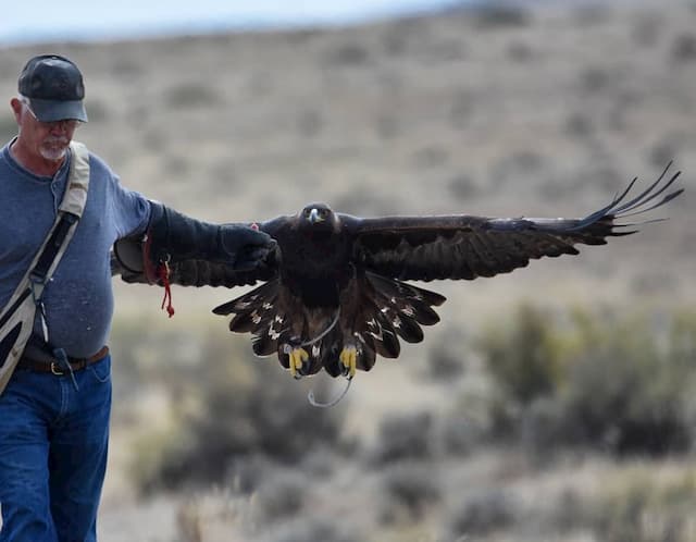 My Eagle had just missed and Jacks was up. In no time we had a long flight on a jack and again a miss. So Alpha decided to sit on a bluff that was a little further away and pout for a while. (Not an uncommon trait of raptors.) So the three of us are just talking and bidding our time awaiting for the Eagles return when he took off again on a game flight in our direction. So I’m thinking that a jack must have hunkered down and finally decided to bolt somewhere close to us and I’m trying to locate where it ran off to. Meanwhile, Scott is watching the bird and comes to the realization that it's not after a rabbit but actually, headed to Scott in a prevention move for her master Jack. Well, just as the Golden was about to crash, Scott did a little jinx of his own and the bird missed him but managed to grab my ankle and then commence to step up my leg sinking it helix talon deep into my calf. I’m squealing like a caught rabbit, Jack is trying to get his bird off of me and Scott is laughing his ass off! Finally, Jack secures the bird, I’m bleeding like a stuck pig and Scott is holding his ribs from laughing so hard.