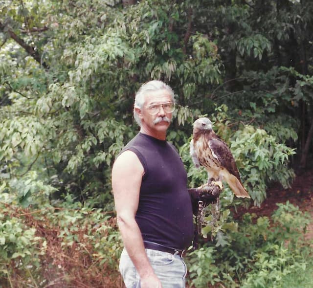 The morning, that Cate Simpson called and told me that Scott had been placed in hospice I realized that my life was about to change. No matter how I rationalized the reasons for his illness , no matter what I thought about my past experiences with Scott, the lives of those who loved and respected him including mine would never to be the same. My mind flashed back forty plus years when this strapping young man came into my life. He was filled with excitement and joy at the thought of becoming a falconer. His love for the sport was obvious. His respect for the birds held true for his entire life. Scott will be remembered as a “renaissance man”. He could do most anything he set his mind to. Not only could be do most anything the things he did he did to his very best. I remember the numerous times we spent together hunting and comparing ideas and thoughts. Most of all I remember the countless hours Scott, Cate and I spent riding the back roads of Georgia in search of the ever elusive perfect red tail. Scott taught me to turkey hunt and was with me when I killed my first Tom turkey. Scott and I were together when we saw our first Harris hawk, an experience that changed us both forever. Memory after memory continue to flood my mind. Life changes us all. Scott and Cate went out west. Occasionally we would chat on the phone or through emails. The last vivid memory I have of Scott was when he and Cate brought his Golden eagle to our clubs annual field meet. I can still see Scott sitting on the edge of his hotel room bed eagle on glove and Cate next to him. That night Scott told me that life could not get any better that that. I believed and continue to believe him.